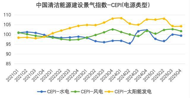 数据显示,2025年第四季度中国清洁能源建设景气指数(CEPI)为108.242,同比下降8.22点,环比下降2.96点,仍处于100-120的较景气区间内。据悉,CEPI以2017年为基期,聚焦水电、核电、风电和太阳能发电四大领域,取值范围0-200,100为景气临界值,此次指数波动主要受清洁能源新增发电装机容量基期增速放缓影响。