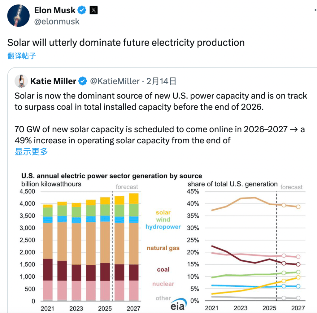 发表上述言论时,马斯克所转载并评论的文章称,光伏已成为美国新增电力装机的主要来源,并有望在2026年底前超越煤炭装机容量。预计2026-2027年将新增70GW光伏发电装机容量,比截至2025年底的规模增加49%。